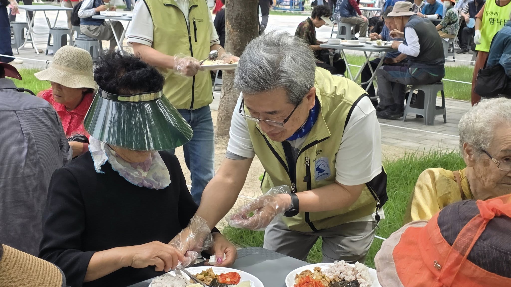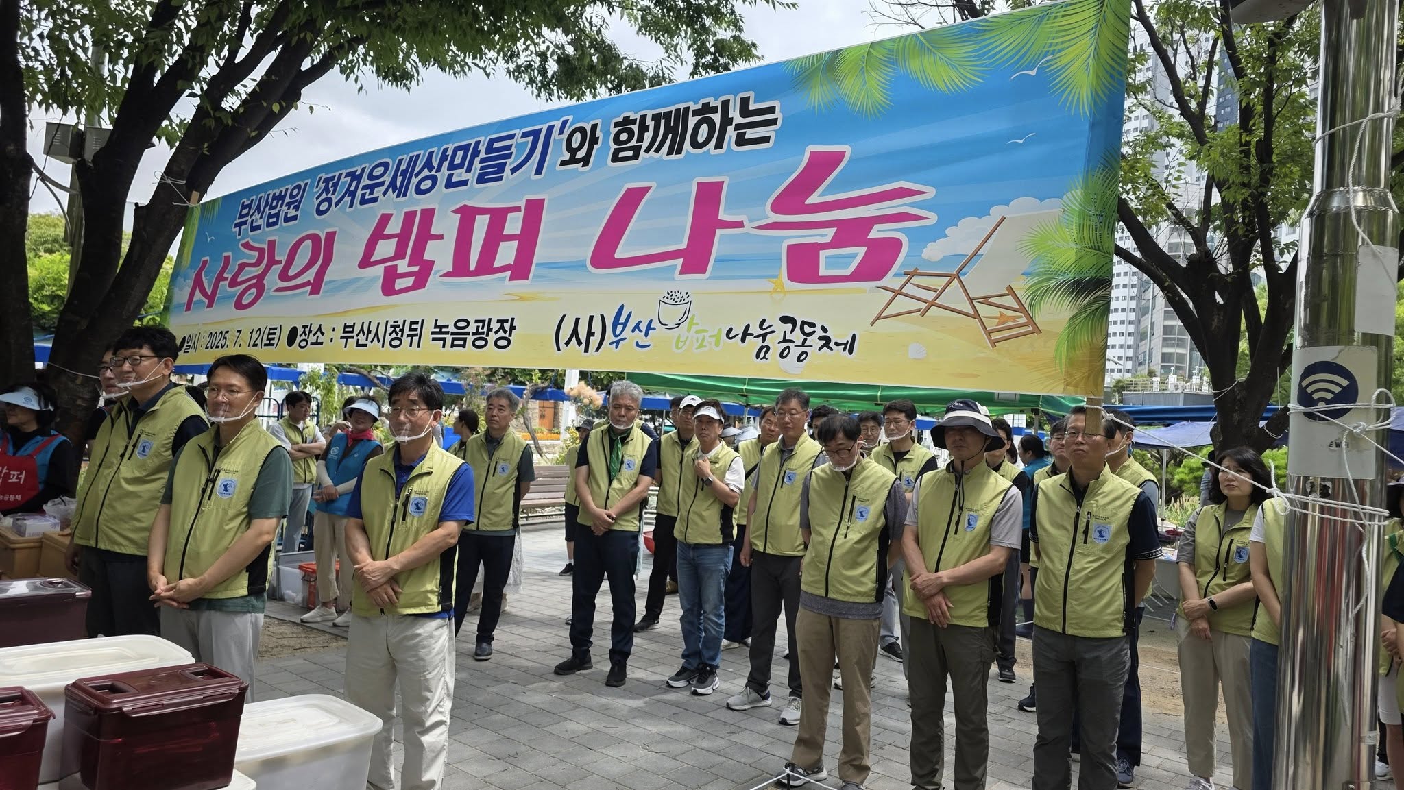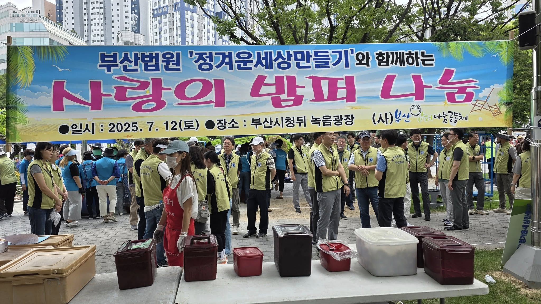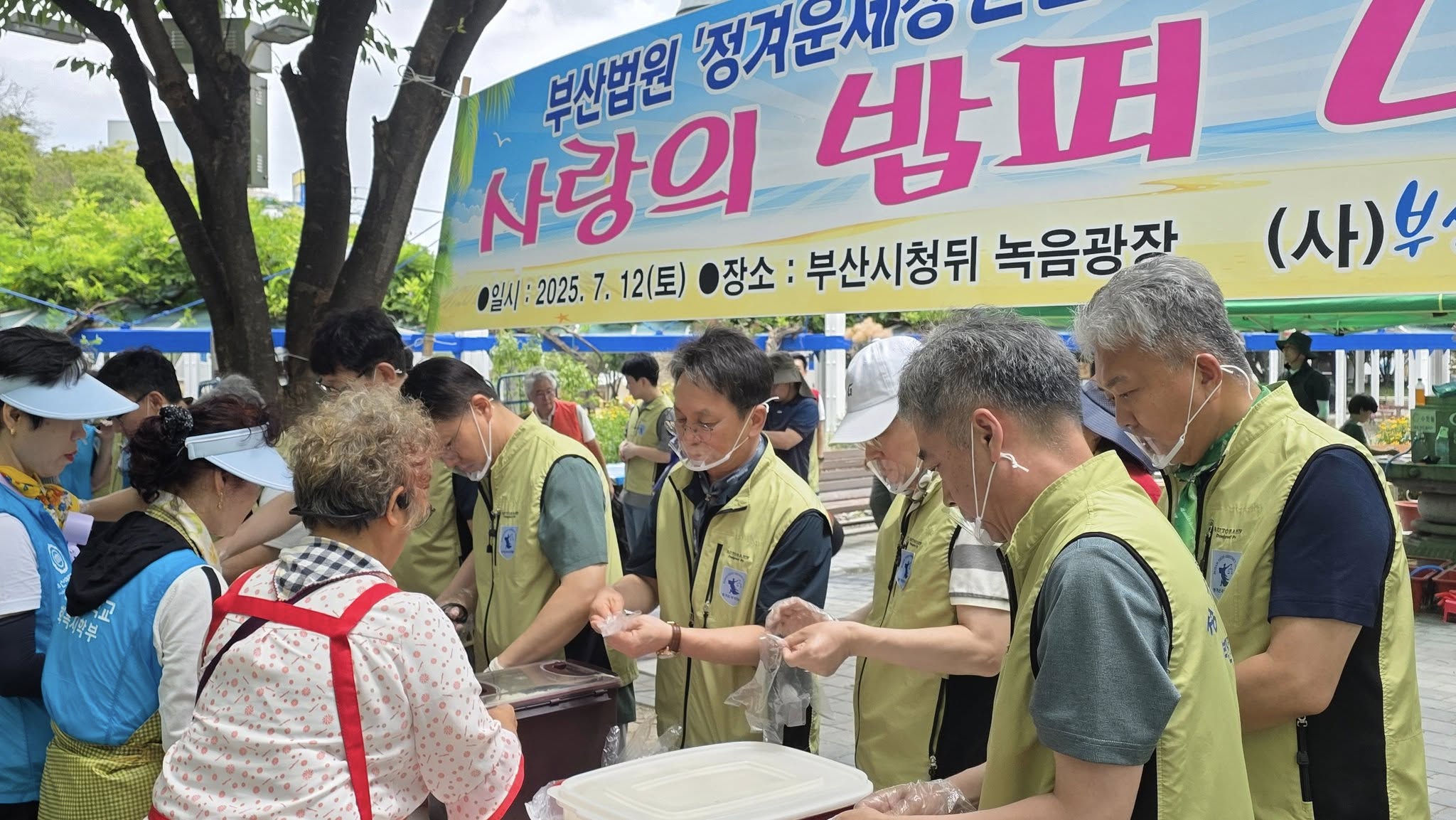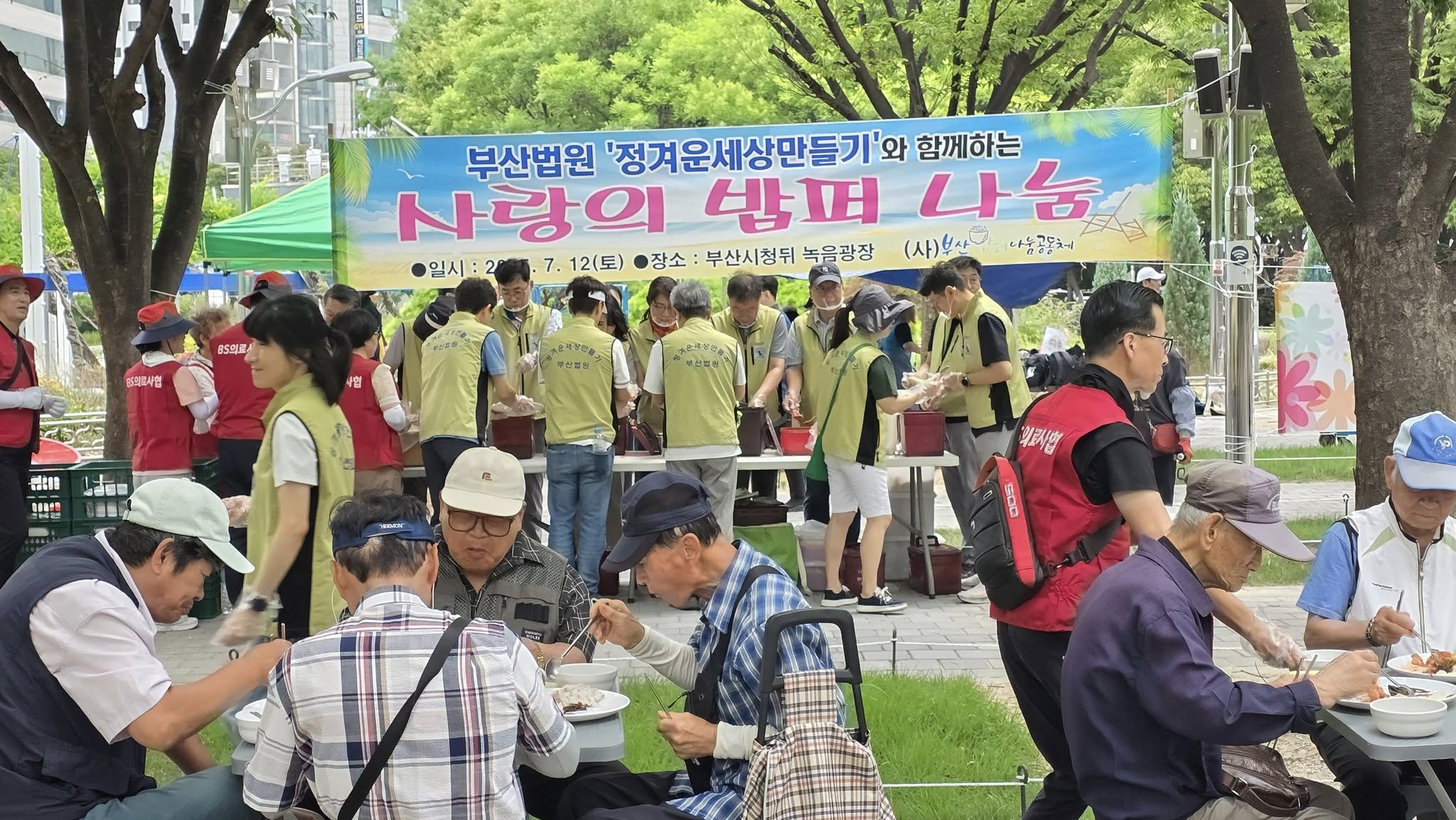 지난 주는 일주일내내 폭염으로 더위에 지친 나날들이었습니다. 그런데 7월12일 토요일 아침은 시원한 바람이 불고 그늘도 많아서 야외에서 밥먹기 딱 좋은 날씨였습니다. 이날 부산시청밥퍼는 공식후원단체가 부산법원 봉사모임 '정겨운세상만들기'였습니다. 이분들이 염원을 모았나봅니다.  박준용회장님은 부산고등법원수석부장판사입니다.작년에 이어서 올해도 참석한 김문관전회장님은 현부산지방법원장입니다. 박종훈부산고등법원장, 전현 가정법원장님 등 법원의 간부들이 총 출동하였습니다. 윤혜영행정관님이 총진행을 맡아서 56명의 회원들이 일사분란하게 움직였습니다. 대부분이 작년에 해본 분들이라 자신감넘치고 표정도 밝았습니다. 음식배식과 배달, 빈그릇 수거 설거지팀에 전달하는 역할을 모두 잘 수행해냈습니다. 부산여자대학교 사회복지학부(정정희ㆍ박정애회장)는 30여명이 매번 설거지를 도맡아 합니다. 설거지야말로 부산밥퍼의 꽃입니다. 보이지않는 곳에서 묵묵하게 뒷마무리를 하지요.  삼성생명 여성분 세분은 여전히 국퍼고, 함나담(함께나누는 상담봉사, 김민주회장)는 질서유지조로 역할을 하였습니다. 그리고 부산디지털대사회복지학과 봉사동아리 '좋은사람들(조미영회장)' 15명은 이번에 처음 질서유지ㆍ자리안내조를 맡아서 하나둘셋넷, 어르신들을 모시고 안내하는 역할을 잘 해냈습니다. BS의료복지단(최종배회장)은 국배달의 역할을 잘 해냈습니다. 부산여상, 해연 친구들도 젊은 기운을 모아서 발랄하게 배달의 기수로서 역할을 잘 해냈습니다. 약150여명의 자원봉사자들이 700여명의 어르신들의 식사를 돕고 마무리까지 같이 하였습니다. 하늘은 맑고 부르렀고, 함께하는 밥퍼공동체는 몸과 마음이 넉넉하였습니다. 밥은 하늘입니다.   나눔과 섬김은 밥퍼정신입니다. 밥은 나누어 먹어야합니다. 갈라묵자!