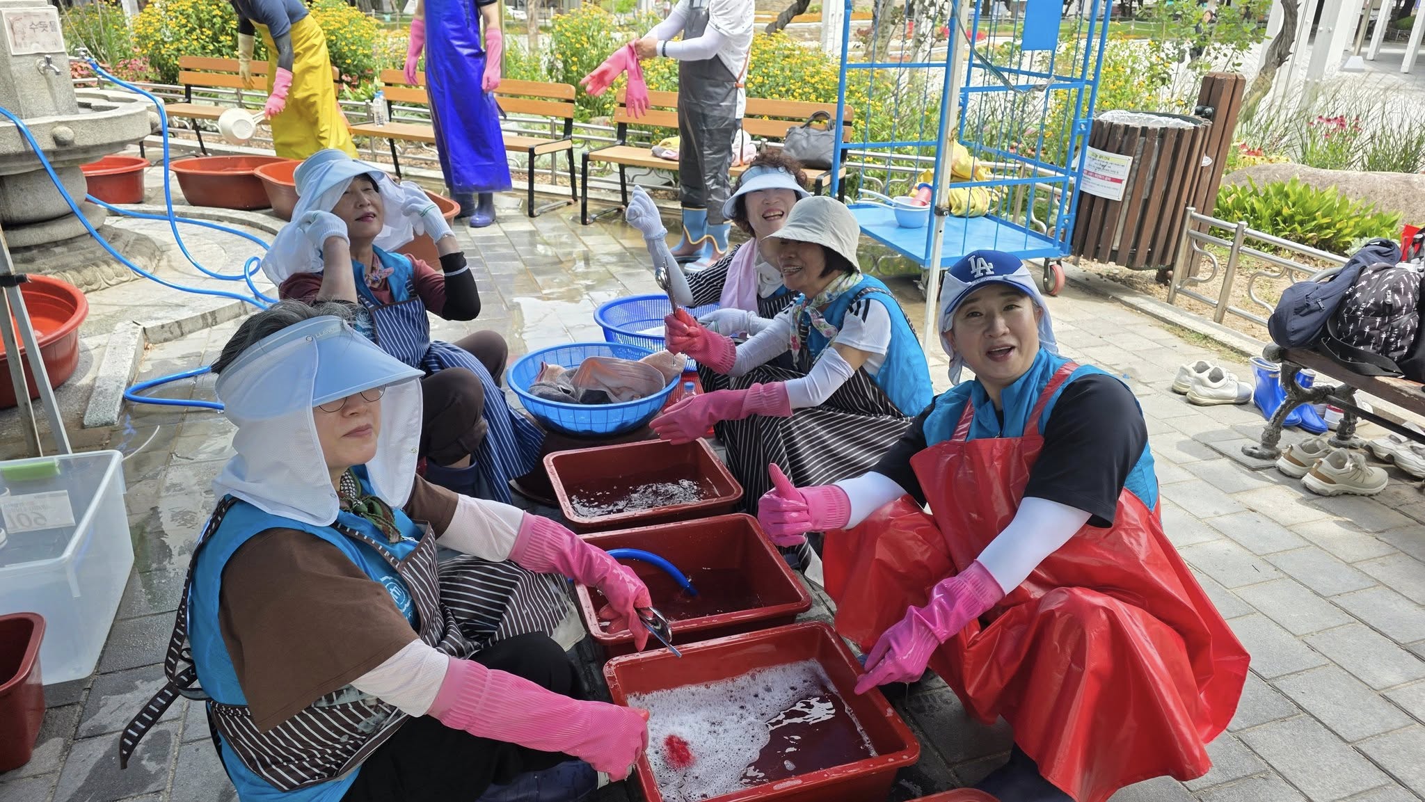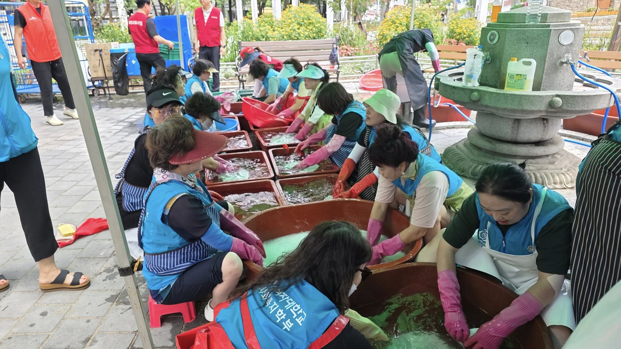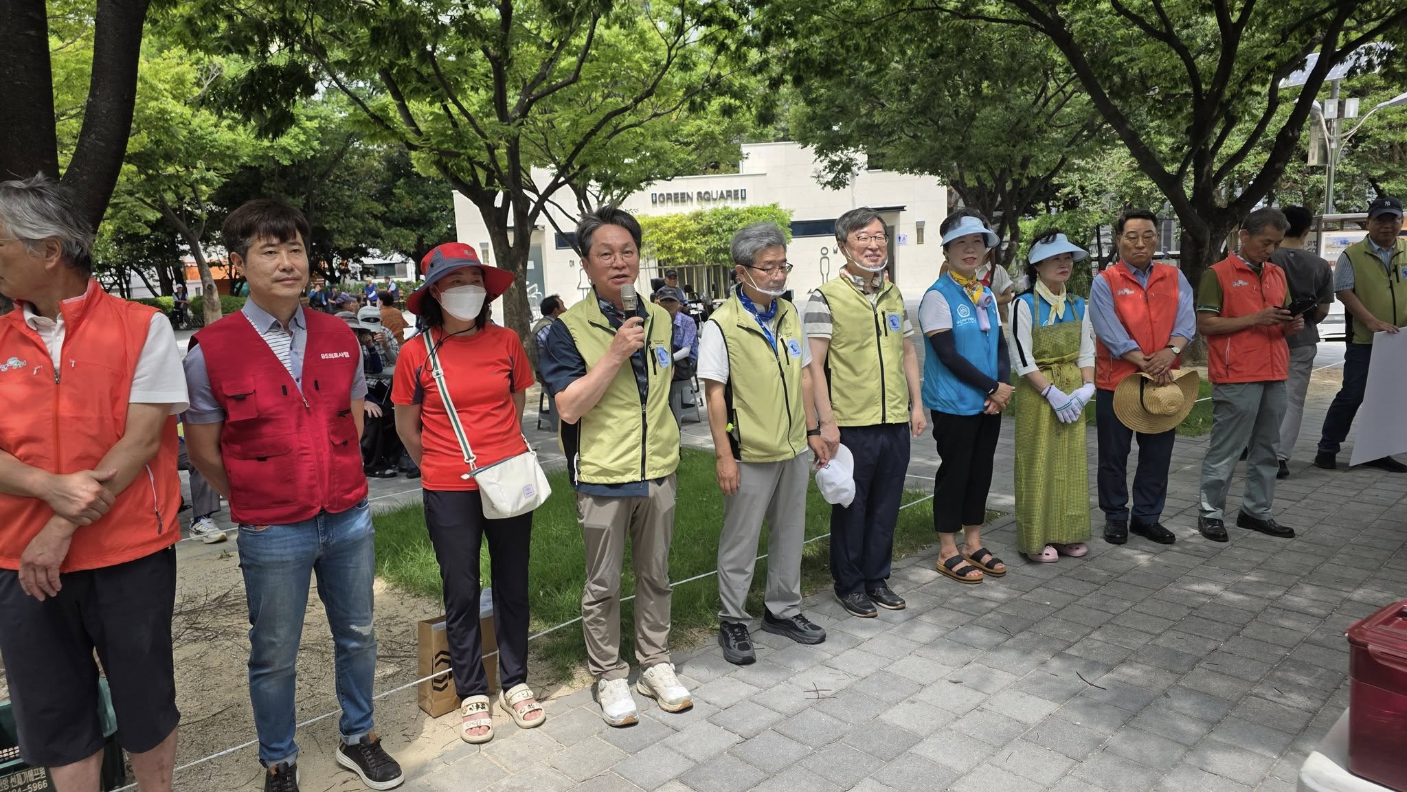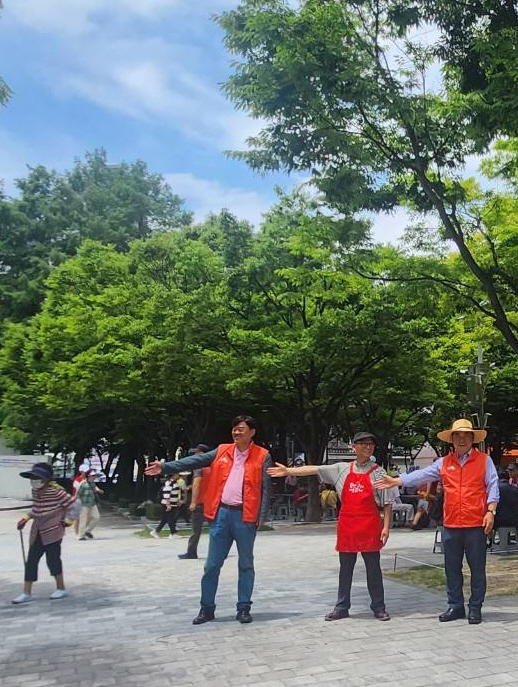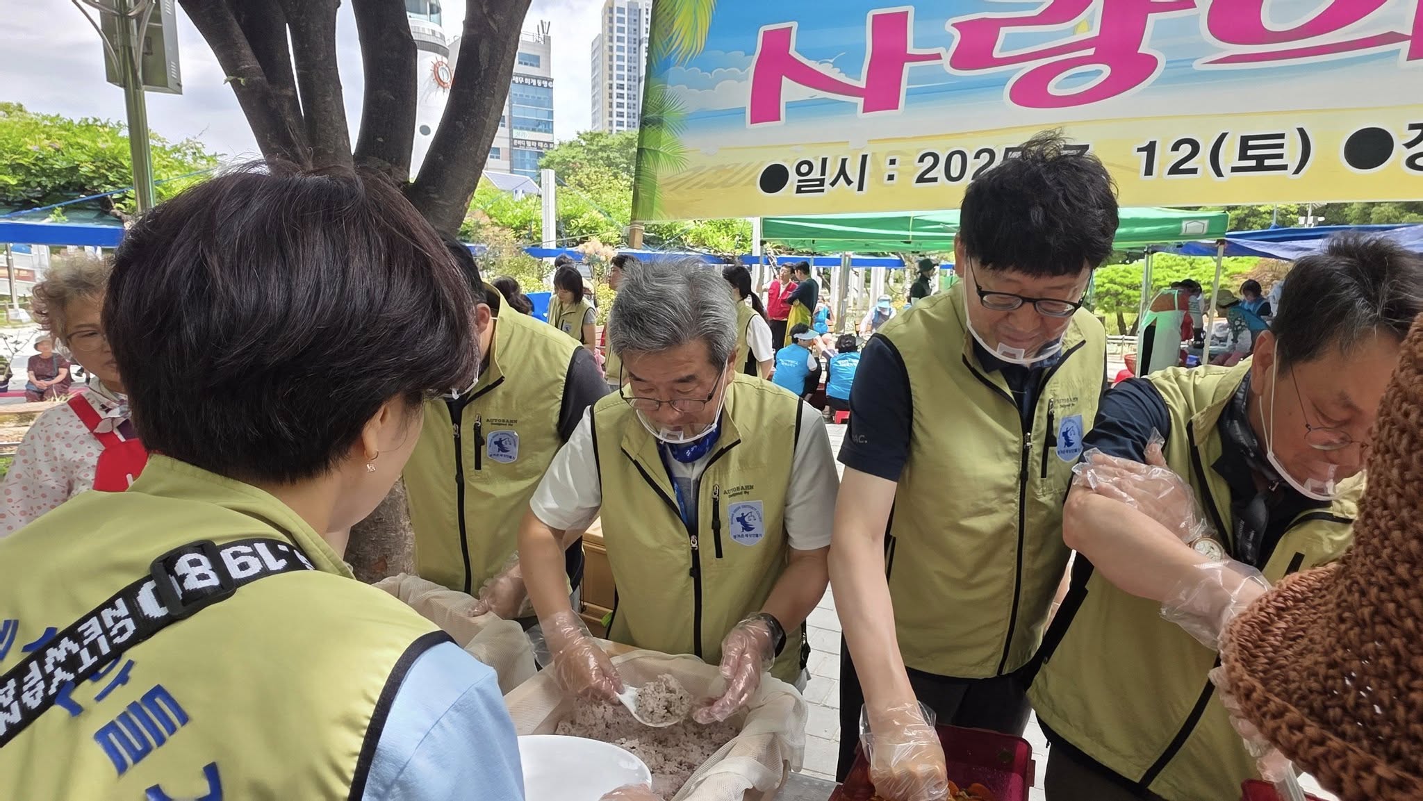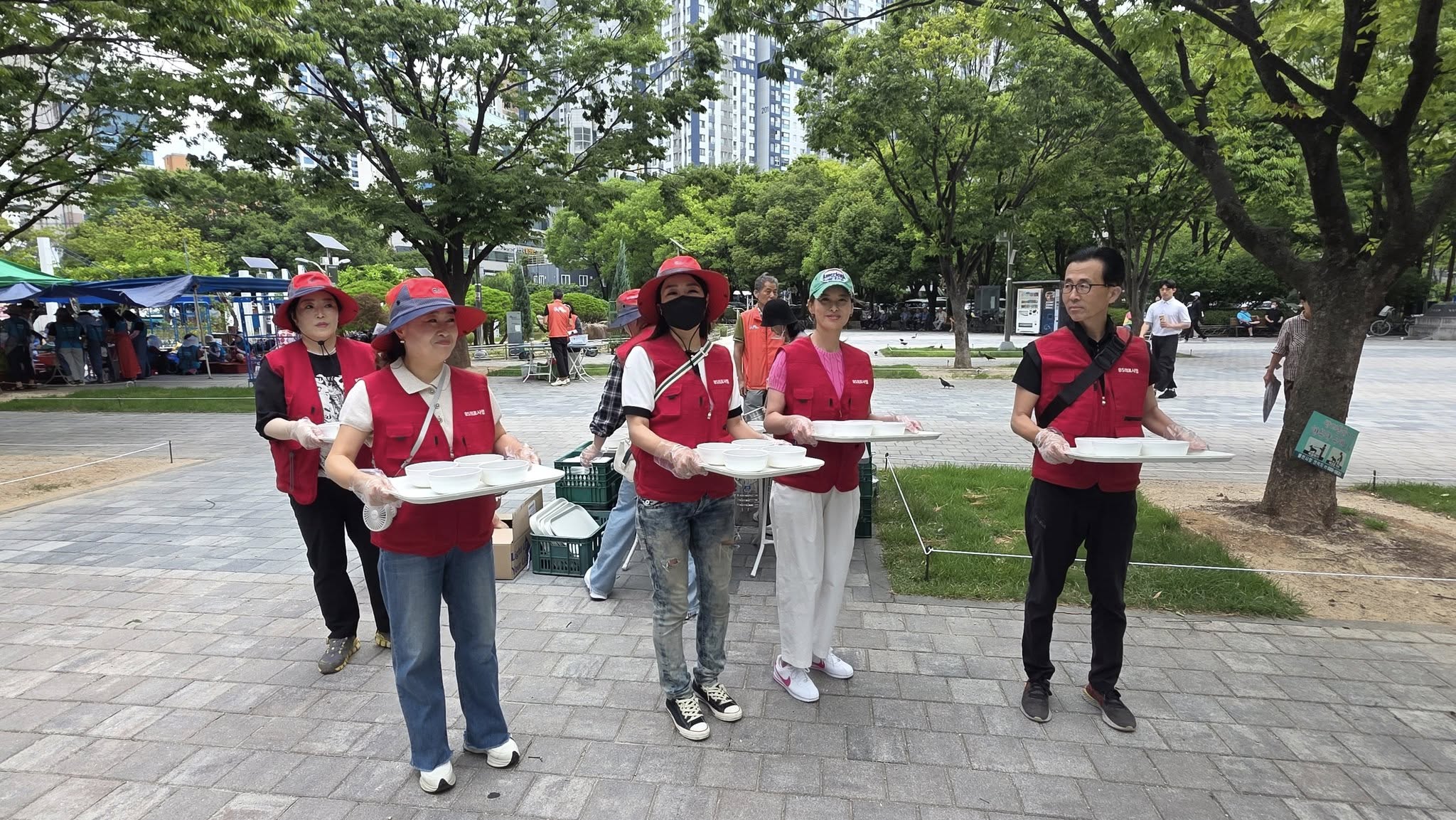 지난 주는 일주일내내 폭염으로 더위에 지친 나날들이었습니다. 그런데 7월12일 토요일 아침은 시원한 바람이 불고 그늘도 많아서 야외에서 밥먹기 딱 좋은 날씨였습니다. 이날 부산시청밥퍼는 공식후원단체가 부산법원 봉사모임 '정겨운세상만들기'였습니다. 이분들이 염원을 모았나봅니다.  박준용회장님은 부산고등법원수석부장판사입니다.작년에 이어서 올해도 참석한 김문관전회장님은 현부산지방법원장입니다. 박종훈부산고등법원장, 전현 가정법원장님 등 법원의 간부들이 총 출동하였습니다. 윤혜영행정관님이 총진행을 맡아서 56명의 회원들이 일사분란하게 움직였습니다. 대부분이 작년에 해본 분들이라 자신감넘치고 표정도 밝았습니다. 음식배식과 배달, 빈그릇 수거 설거지팀에 전달하는 역할을 모두 잘 수행해냈습니다. 부산여자대학교 사회복지학부(정정희ㆍ박정애회장)는 30여명이 매번 설거지를 도맡아 합니다. 설거지야말로 부산밥퍼의 꽃입니다. 보이지않는 곳에서 묵묵하게 뒷마무리를 하지요.  삼성생명 여성분 세분은 여전히 국퍼고, 함나담(함께나누는 상담봉사, 김민주회장)는 질서유지조로 역할을 하였습니다. 그리고 부산디지털대사회복지학과 봉사동아리 '좋은사람들(조미영회장)' 15명은 이번에 처음 질서유지ㆍ자리안내조를 맡아서 하나둘셋넷, 어르신들을 모시고 안내하는 역할을 잘 해냈습니다. BS의료복지단(최종배회장)은 국배달의 역할을 잘 해냈습니다. 부산여상, 해연 친구들도 젊은 기운을 모아서 발랄하게 배달의 기수로서 역할을 잘 해냈습니다. 약150여명의 자원봉사자들이 700여명의 어르신들의 식사를 돕고 마무리까지 같이 하였습니다. 하늘은 맑고 부르렀고, 함께하는 밥퍼공동체는 몸과 마음이 넉넉하였습니다. 밥은 하늘입니다.   나눔과 섬김은 밥퍼정신입니다. 밥은 나누어 먹어야합니다. 갈라묵자!